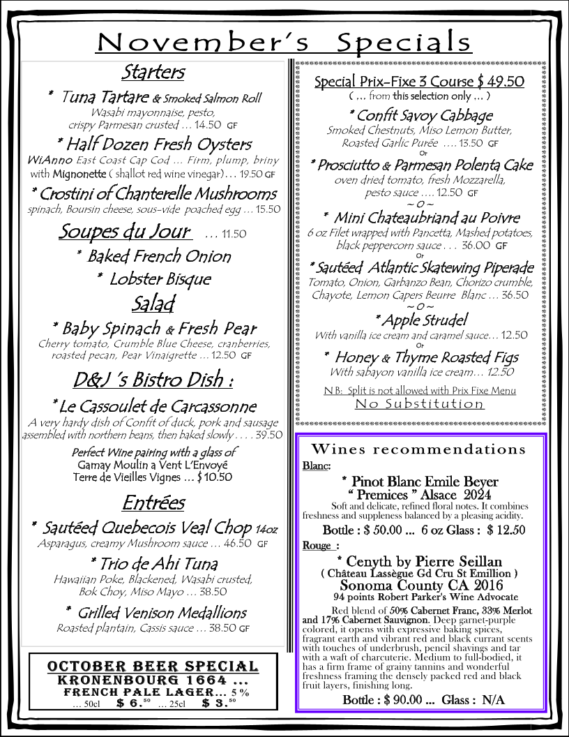 * Steak Frites … NY Prime 6 oz choices of Mashed Potato or Fries GF